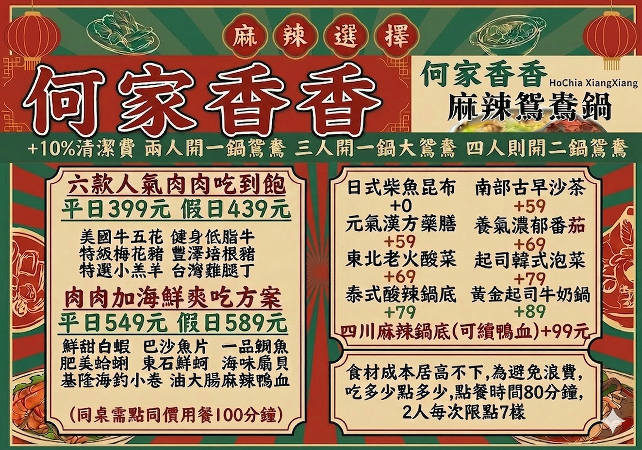 立即訂位 🔥 自助吧全面升級! 🔥🍖 六款人氣肉肉吃到飽 美國牛五花、健身低脂牛、 皇冠梅花豬、 豐澤培根豬、 特選小羔羊、 台灣雞腿丁 🦐 海陸爽吃方案 鮮甜白蝦、巴沙魚片、一品鯛魚、肥美蛤蜊、東石鮮蚵、大扇貝、海釣小卷, 船凍直送,新鮮到桌! 生鮮時蔬、A級火鍋料。 自助吧加了這些👇🍦 泰國皇室冰淇淋(榴槤、椰奶、芋頭、泰奶) ☕ UCC黑咖啡、熱拿鐵、熱可可、摩卡咖啡 🧃 嘉義四味果汁冰沙(這個真的很難得) 🍵 熱茶包6種選擇,從香片到金萱烏龍都有 🍮 綠豆豆花、薏仁豆花、仙草凍、小蛋糕、當季水果 慶祝升級,現場買100元會員卡直接送500元 100元當天就能抵,剩下400元每次可抵100元慢慢用。 💰 肉肉方案 平日399 假日439(孩100-140公分220-240元,未滿100公分50元) 💰 肉+海鮮 平日549 假日589(孩100-140公分275-295元,未滿100公分50元) (另加10%清潔費,只收現金) ⏰ 平日16:00前 120分鐘 ⏰ 晚餐及假日 100分鐘 從家庭餐桌到餐飲夢想何大哥深諳火鍋的魔力。在他的心中,一鍋冒著熱氣的湯底不僅僅是一道菜,更是凝聚家人、朋友間情感的媒介。每當全家人圍坐在冒著熱氣的火鍋旁,笑聲、暖意與食物的香氣交織,這樣的畫面總讓何大哥心中湧起一股暖流。 「如果能將這份幸福感擴大,讓更多人體驗到呢?」帶著這個美好的願景,何家香香麻辣鍋的概念應運而生。 用心熬煮 九款好湯底 輪番上桌!! 【清爽經典】 🌿日式柴魚昆布鍋: 經典不敗金湯,最能襯托肉片鮮甜。 🍎 東北老火酸菜: 蘋果鳳梨自然發酵,酸甜層次清爽不膩。 🍋 泰式酸辣鍋: 檸檬香茅異國風情,酸辣帶勁瞬間開胃。 【香辣濃郁】 🔥 正宗四川麻辣: 慢火熬製五香中藥,呈現「麻、辣、鮮、香」極致平衡。 🇰🇷 起司韓式泡菜: 熟成泡菜交織金黃起司瀑布,奶香牽絲、鹹濃成癮。 🍤 爆香古早沙茶: 鹹香古法沙茶,是海鮮控首選的鮮味加號。 【醇厚乳香】 🥛 黃金起司牛奶: 純淨乳香與起司交融,滑順如絲綢般的溫柔口感。 【溫潤養生】 🤎 元氣漢方藥膳: 多種中藥材精燉,補氣驅寒、溫潤暖身的首選。 🍅 養氣濃郁番茄: 滿滿番茄紅素,自然酸甜鎖住身體的健康能量。 用心選材,呈現極致「我想為客人提供的,就是我自己和家人會喜歡吃的東西。」這句樸實無華的話語,道出了何家香香麻辣鍋的核心理念。 為實現這一承諾,何大哥堅持: • 嚴選新鮮食材,確保每一份食材都達到最佳品質 • 精心調配湯底,平衡麻辣鍋的香、辣、鮮、香四重滋味 • 注重用餐環境,營造溫馨舒適的氛圍 用心做好每一鍋, 為您呈現最道地的麻辣滋味! 精心熬製参味湯底匠心獨運:正宗四川麻辣 的誕生 一鍋好湯是美味火鍋的靈魂。懷著這個信念,何大哥潛心研究,終於開發出了店裡的招牌麻辣湯底。 這款湯底是何家香香麻辣鍋引以為傲的秘方,搭配精選的五香料及中藥,長時間熬製【麻、辣、鮮、香】一鍋呈現。 超派船凍海鮮船上一捕撈,馬上冷凍鎖住新鮮,提供豐富的海鮮品項:大白蝦、魚片、蛤蜊、鮮蚵、大扇貝、小卷、刻花魷魚、大花枝圈、螃蟹等。 滿足海鮮愛好者的味蕾,所有海鮮都我們的千挑萬選,美味好吃才提供給大家。 現切原塊肉品堅持不用重組肉,精選多國優質肉品:美國牛五花、草飼低脂牛、台灣梅花豬、伊比利豬、紐西蘭及澳洲小羔羊、台灣雞腿丁 多樣化的肉類選擇,適合不同口味偏好,親民的價格也能吃的開心吃得安心。 產地直送蔬菜農地直銷蔬菜,確保新鮮度,豐富多樣的蔬菜選擇:茼蒿(冬季)、高麗菜、大陸妹、水蓮、花椰菜、甜玉米等…強調健康飲食,平衡營養。 人氣續碗級滷肉飯特地回嘉義的名店學習,獨特的南部口味香油而不膩口味,請你一定要添一碗滿滿的白飯來品嘗。 A級火鍋料提供A級火鍋料供選擇,特色單品包括:手工蛋餃、滷大腸、大芋貢、香貢、龍蝦沙拉、鳥蛋等。 廚房採用360度渦流臭氧消毒洗菜機更乾淨,無殘留的安心蔬菜! 老闆特別下重本,在廚房使用360度渦流臭氧消毒洗菜機,透過離心作用產生強力瀑布溫水流清洗,更能有效去污,分解防腐劑,去重金屬,更能降解農藥,就是要讓消費者吃到無殘留,更乾淨的蔬菜。 肉品來源 雞肉原產地台灣 豬肉原產地台灣、西班牙伊比利 牛肉原產地美國、巴拉圭 羊肉原產地澳洲、紐西蘭 LINE訂位 最新消息 藥膳養生鍋-中和最強吃到飽鴛鴦鍋【何家香香麻辣鍋】 2025 年 1 月 3 日 最新消息,優惠活動 上周一推出 大受好評 整間店都是暖心的藥膳味! 寒流來襲,您還在家裡裹著棉被發抖嗎?... 何家香香吃到飽火鍋 全新推出三大人氣湯底【藥膳養生鍋】、【蕃茄元氣鍋】與【海味沙茶鍋】 2024 年 12 月 28 日 最新消息,優惠活動 寒流來襲,暖胃又暖心! 何家香香吃到飽火鍋 全新推出三大人氣湯底選擇:... 新北最強「海鮮吃到飽」來啦!何家香香麻辣鍋 2024 年 12 月 17 日 優惠活動,最新消息 在這裡,您可以隨心所欲地享受新鮮海鮮, 不用單點、無需等待! 自助吧台上滿滿的海鮮任您選擇: 牡蠣... 123456 交通資訊於板橋公車站搭乘307號、793號 開往積穗國中的公車 下車後步行4分鐘即可抵達 停車資訊• 積穗國小停車場 新北市中和區員山路152號 全日收費 30元/hr,12小時最高180元,夜間收費 10元/hr(22-8) • 中和民樂停車場 新北市中和區民樂路65號立體停車場 30元/h,營業時間24hr
